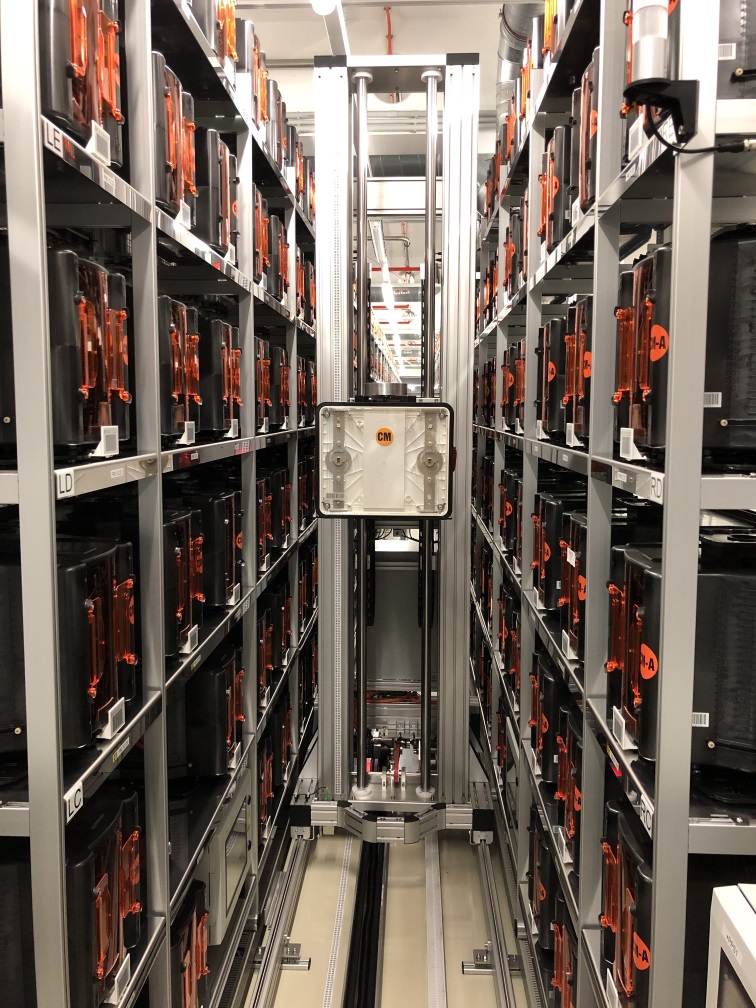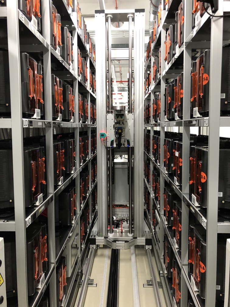 Für das Ein- und Auslagern verfährt die Handlingseinheit auf einer ca. 35m langen Linearachse und greift auf die beidseitig stehenden Regale mit ihren 6 Etagen zu.
